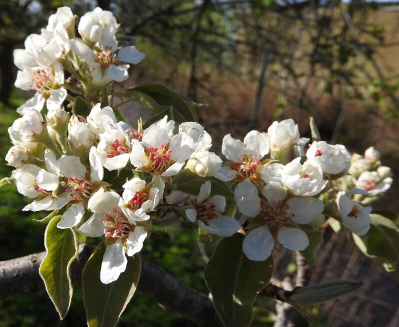 Birnbäume haben oft eine pyramidale Kronenform, selten werden sie über 15 m hoch. Die Rinde weist frühzeitig eine schwarzgraue, durch Längs- und Querrisse zerklüftete Borke auf. Die Blätter sind eiförmig, fein gesägt und dunkelgrün glänzend.